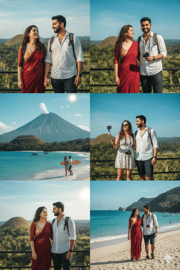Couple Travel Vlog Aesthetic Make this uploaded photo into a model, copying 100% of the facial features. Render it realistically in 8K resolution. A stylish travel couple exploring the 7 Wonders of the Philippines — holding hands, laughing, taking selfies, and admiring scenic landscapes. Include iconic backdrops like Chocolate Hills, Mayon Volcano, and Siargao waves.