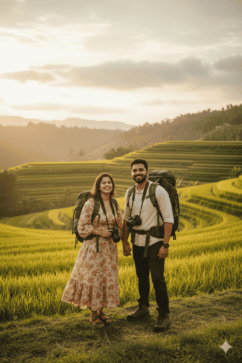 Make this uploaded photo into a model, copying 100% of the facial features. Render it realistically in 8K resolution. A smiling couple stands before stunning terraced rice fields at sunrise or sunset. Dressed for travel with cameras and backpacks, they radiate warmth and adventure amid the golden landscape.