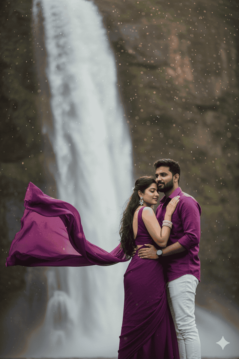 A romantic pre-wedding photoshoot at a beautiful waterfall. The girl is wearing a deep purple chiffon saree with a sleeveless, backless purple blouse. She is adorned with elegant pearl jewelry, including pearl bangles on her hands. The saree's pallu flows dramatically in the wind, adding movement to the scene. Her long, lightly curled hair is open and cascading naturally. Behind her, the boy stands close, wearing a purple shirt with white jeans. He gently holds her from the back as she rests her head tenderly against his chest. The waterfall creates a dreamy, romantic backdrop with misty droplets in the air, enhancing the magical atmosphere
