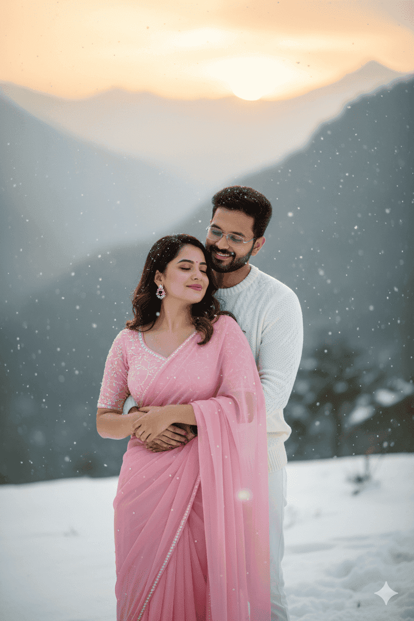 generate a full-size 4k hyper- realistic cinematic portrait of them standing together in snowing mountain -Keep the faces exactly the same as the uploaded photos for originality. - The girl is wearing a beautiful pinteresty baby pink chiffon saree, with baby pink half sleeve blouse with matching pearl jewellery natural look details and snow drops on fabric. Her hand is hug him hug pose She is looking at the background with a soft, romantic expression. Girl eye close. - The boy, wearing a white sweater, is standing behind of the girl, he is gently hug her creating a pose intimate and romantic pose. Boy eyes close - Both are smiling and enjoying the snow view mountain moment with love and warmth - The atmosphere should be cinematic: visible snow drops, snow glistening on clothes and soft mountain sunset view background with glowing sunset light or a dreamy backdrop. - Make the overall scene intimate, romantic, vibrant, and full of emotions -like a Bollywood romantic movie sequence.