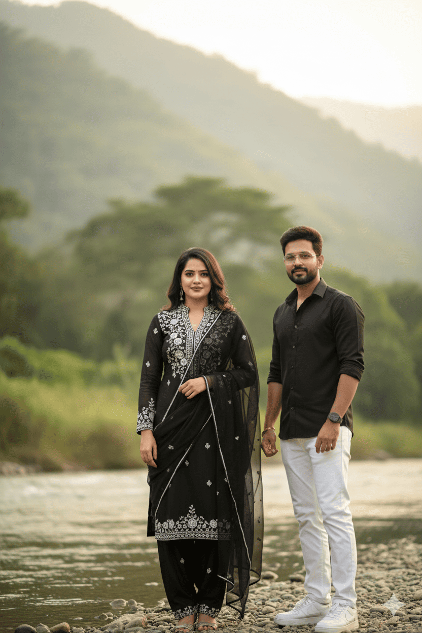 Ultra-realistic HD young couples and medium-length portrait of an Indian woman with brown hair flowing around her shoulders. She is wearing an elegant black traditional Indian outfit black suit and salwar with delicate white embroidery detailing on the sleeves and neckline. A Man wears elegant -black shirt and white pant and glasses and white Nike Air Sneakers A matching black dupatta (scarf) is draped around her neck. The background is a simple, blurred outdoor in mountain and river and