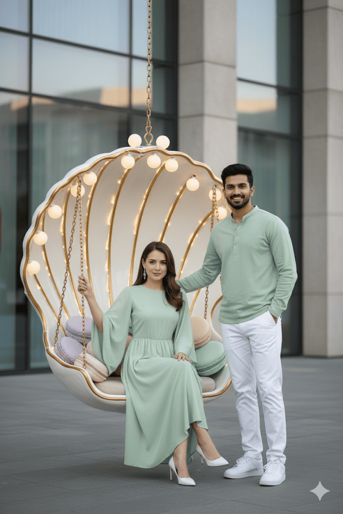 Take a picture of a beautiful and elegant young couples with straight hair with curly underneath, with her hair down one of the shoulders , wearing a fancy dress with green open sleeves and white high heels, and A Man wearing Soft green Shirt and white pant and air jordan shoes and sitting graceful on a shell- shaped swing decorated with white ball and gold accents, with pastel macaroni pillows, in front of modern building. Face as photographed without changing the original face.