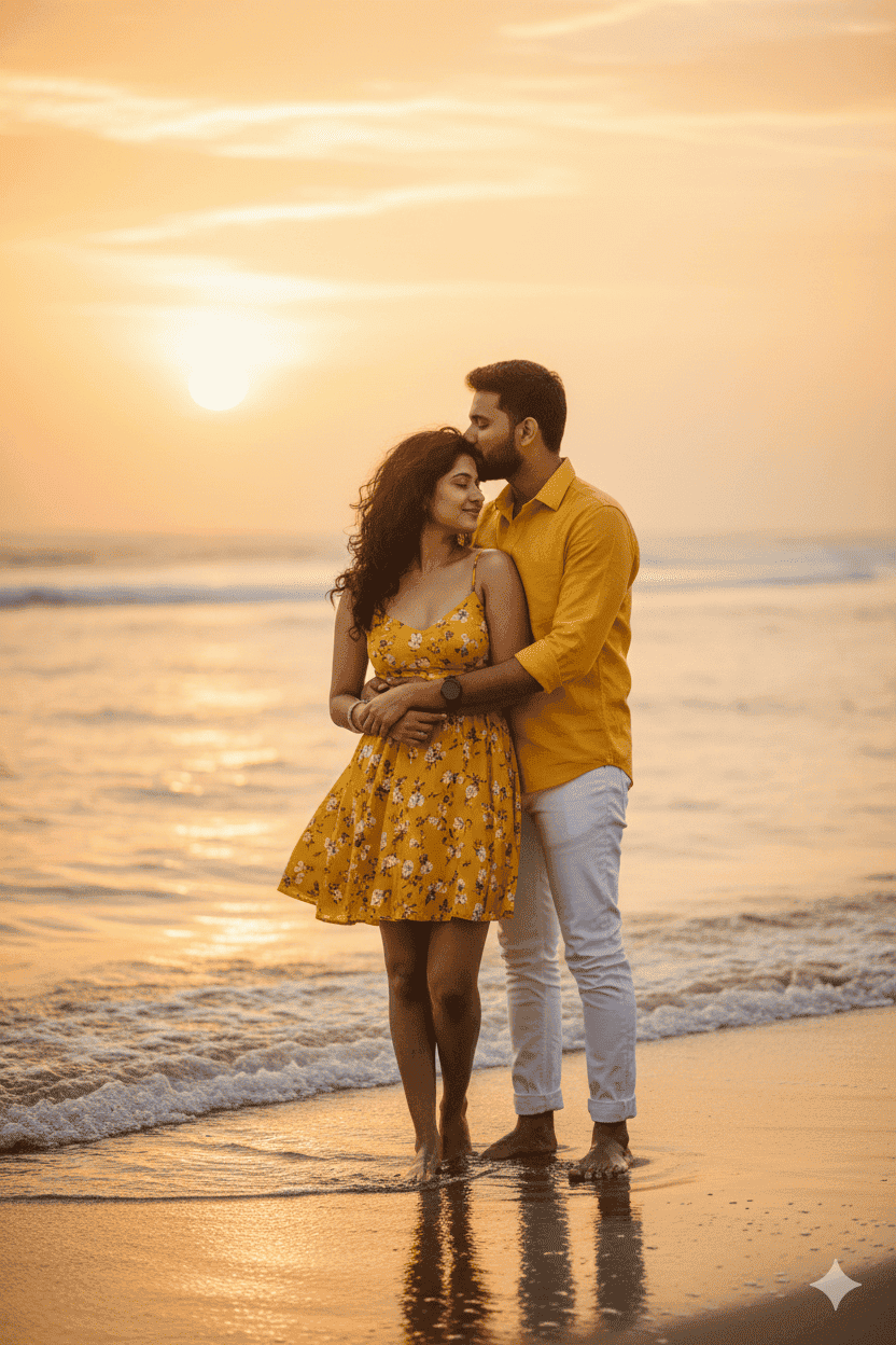 A romantic couple chilling on the beach at sunset. The boy gently kisses the girl on her forehead while holding her close, both smiling softly with the exact same facial expressions as in the reference image. The girl wears a short yellow floral dress, her curly messy hair blowing slightly in the sea breeze. She has a natural, effortless look. The boy is dressed in a bright yellow shirt and white jeans. Gentle sea waves touch their feet, and the warm sun casts a golden, romantic glow over the scene