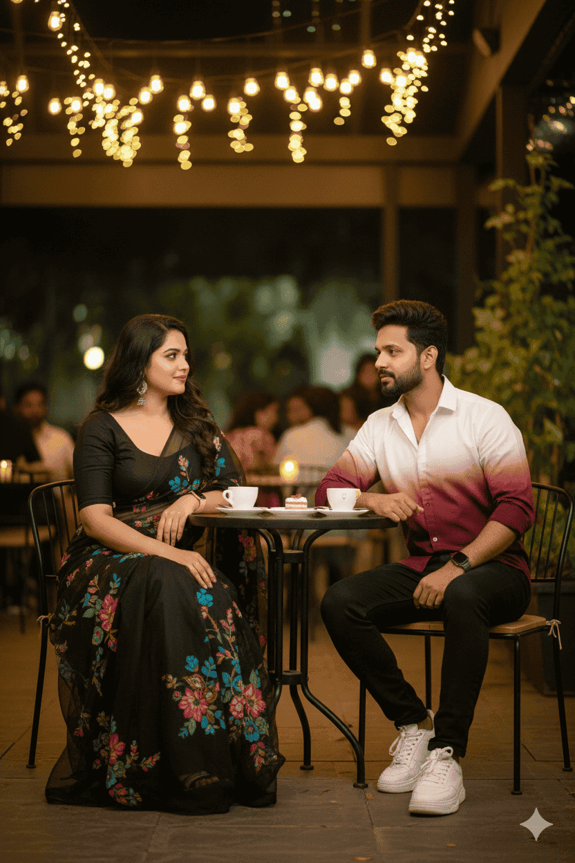 Create A full body, 21 year old young couples, a woman wearing an elegant -black transparent saree with colourful design paired black blouse (100% same face as reference) with stylish dark and slightly brown hair, well groomed beard, sits at an outdoor cafe at night, he is slightly side look and cross the legs stylish pose, wearing a stylish gradient marun-vibrant white shirt with folded sleeves, fitting black jeans, white chunky shoes, real face