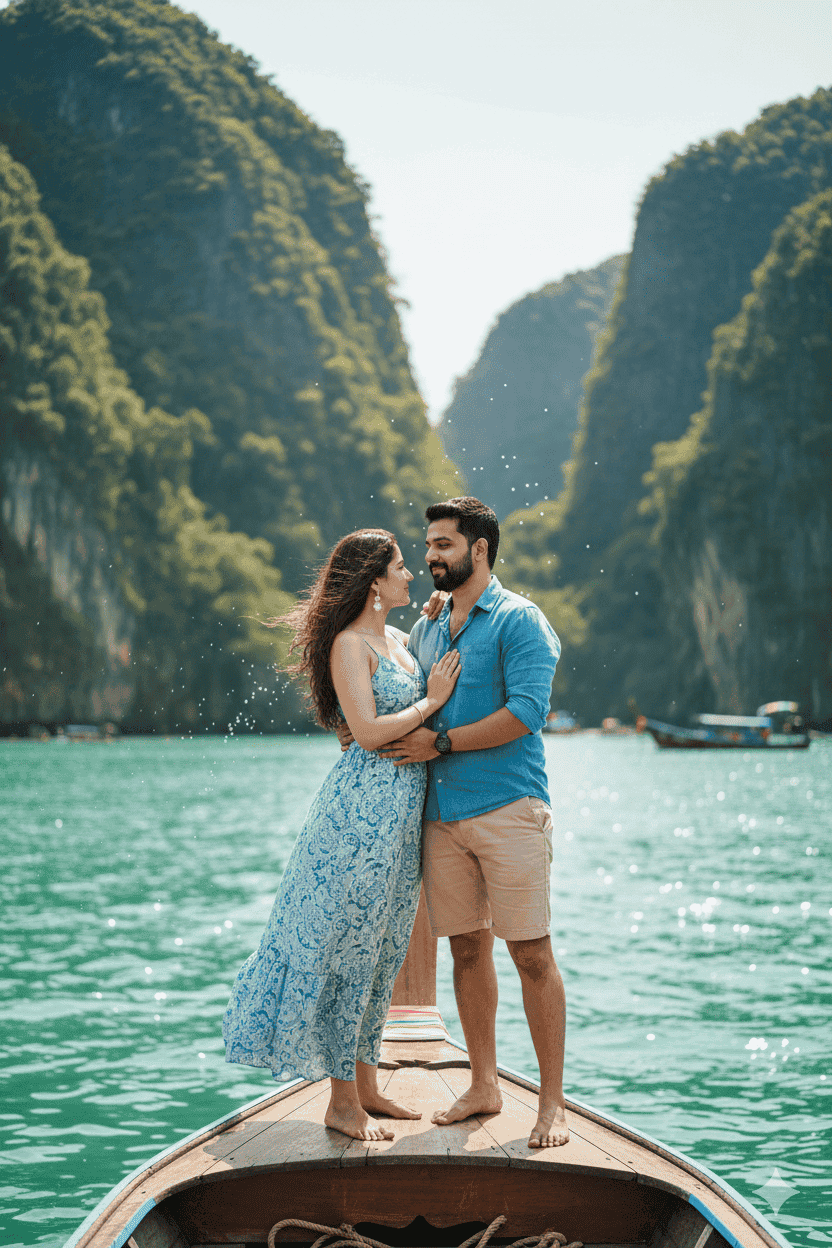 Longtail Boat Adventure (Andaman Escape) Make this uploaded photo into an ultra-realistic, full-body cinematic shot with a wide-angle, lifelike perspective. Capture crisp 8K details with a naturally sharp, unblurred background. The subject should strike a beautiful, natural pose that complements the location, while the outfit perfectly matches the surroundings. The final image should look refined, polished, and worthy of a high-end film still. The couple are standing together on the boat’s prow, sea spray in the air, limestone cliffs behind — adventurous and free-spirited vibe.