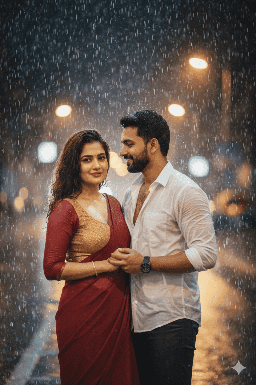 generate a full-size 4k hyper- realistic cinematic portrait of them standing together in the rain. -Keep the faces exactly the same as the uploaded photos for originality. The girl is wearing a beautiful pinteresty red chiffon saree, with full sleeve blouse with matching jewellery natural wet-look details and raindrops on her skin and fabric. She is looking forward with a soft, romantic expression. The boy, wearing a soaked white open shirt, is standing front of the girl, gently holding her hands creating an intimate and romantic pose. Both are smiling and enjoying the rain moment with love and warmth, looking each other The atmosphere should be cinematic: visible raindrops, water glistening on clothes and skin, soft blurred background with glowing streetlights or a dreamy backdrop. Make the overall scene intimate, romantic, vibrant, and full of emotions -like a Bollywood rain sequence.