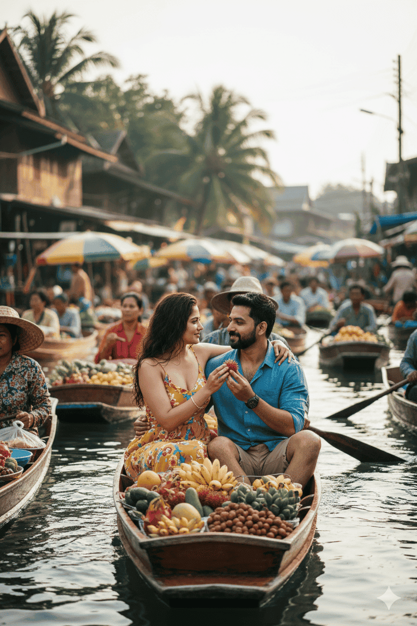 Floating Market (Vibrant Culture) Make this uploaded photo into an ultra-realistic, full-body cinematic shot with a wide-angle, lifelike perspective. Capture crisp 8K details with a naturally sharp, unblurred background. The subject should strike a beautiful, natural pose that complements the location, while the outfit perfectly matches the surroundings. The final image should look refined, polished, and worthy of a high-end film still. The couple are sharing local fruit together, surrounded by vivid tropical colors — cinematic composition full of life and texture.