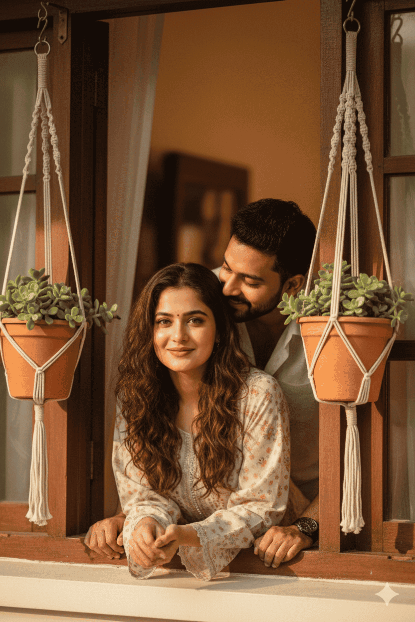 ultra-realistic portrait of a young couples leaning out of a wooden window, smiling softly with her eyes opened and lips in a playful expression. She has long, wavy brown hair and is wearing a Pakistani loose pattern Aghanoor brand light colour kurti , deep. Warm natural sunlight illuminates her face. Two hanging potted plants with green succulents in macrame holders frame the window. The background inside the room is softly blurred, giving a peaceful, homely atmosphere. 100% Same Face match in reference.
