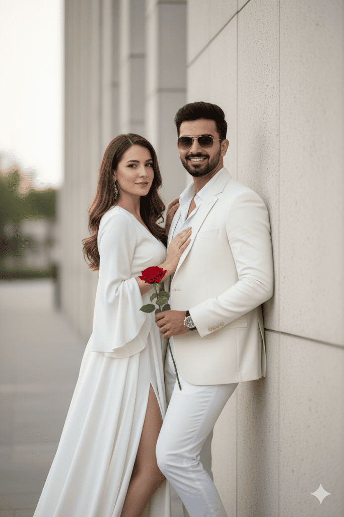 From the reference photo make hyper realistic 8k photo of High-fashion white goldan -and-white cinematic portrait, face match 100%. A 30 years boy in a suit with an open-collar shirt leans casually against a wall, holding a flower gulab in one hand, wearing Sunglasses,confident and relaxed. A slim woman and white outfit stands close, pressing against him, one hand resting on his hip, exuding intimacy and allure. Soft smile. Face should be 100 percent same as reference photo