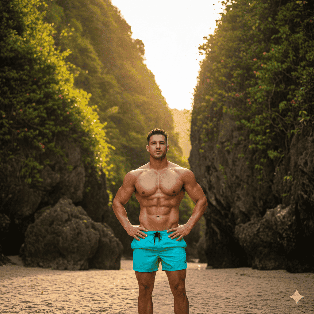 Full-body portrait of man on sandy cove between cliffs. Turquoise swim shorts, wet skin glistening, hands on waist. Canon EOS R5 + 35 mm f/1.4 L, f/1.4, 8 K, 9 : 16, vivid background greenery, cinematic golden sunlight.