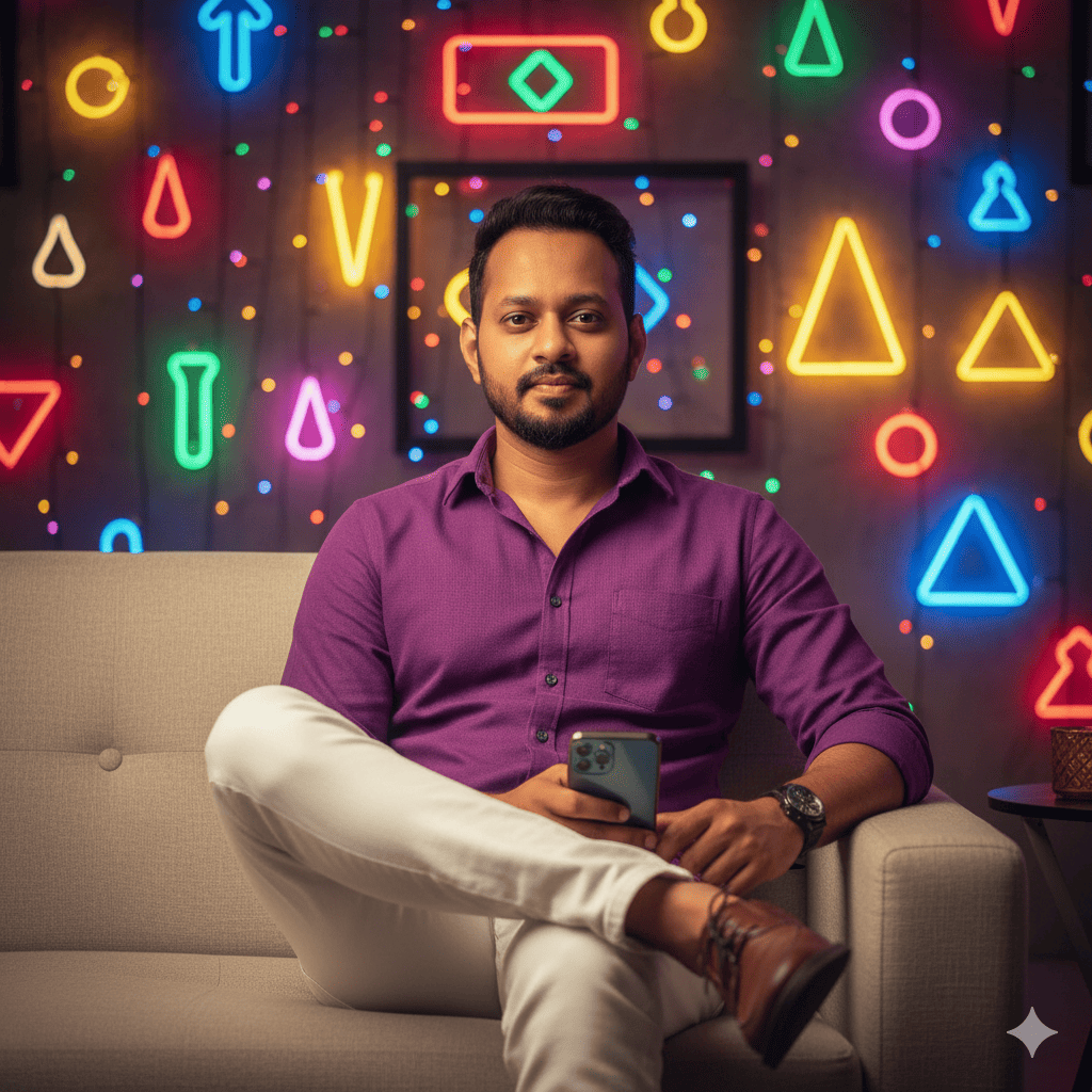 "Ultra-realistic cinematic 4k portrait of a stylish young man with the same face as the provided reference photo. He is sitting confidently on a modern sofa in a beautifully decorated room, surrounded by glowing, colorful decorative lights that create a festive, vibrant atmosphere with warm reflections. He is wearing a purple shirt paired with white jeans, styled in a fashionable and modern way. In his hand, he is casually holding the latest iPhone adding a premium touch to his look. The man poses in a relaxed yet confident manner, captured in realistic lighting with high detail, cinematic tones,