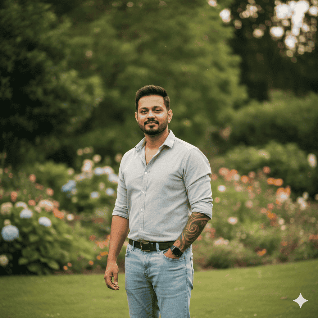 A natural outdoor portrait of a young man (your face) standing in a garden with a soft, blurred background of green trees and flowers. He has neatly styled hair and a short beard, wearing a light grey button-up shirt with the sleeves rolled up and light blue jeans. His expression is calm and confident, with a gentle smile on his face. One hand is in his pocket, and he wears a black smartwatch on his wrist. The lighting is soft and even, creating a warm, relaxed, and realistic portrait look — perfect for a professional profile or casual photoshoot