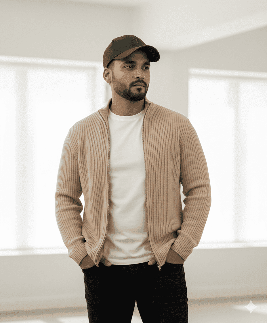 A confident man in his late 20s, with a short beard and dark hair, stands indoors. He is wearing a forest green baseball cap, a beige ribbed knit cardigan with a zipper closure, and a plain white crew-neck t-shirt. His hands are in his pockets, and he is looking slightly to his right, with a serious expression. The background is a minimalist, modern room with white walls and soft, natural lighting. 100% use my upload reference image image generate