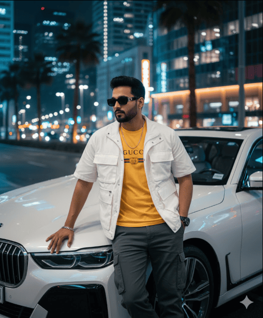 (Use reference photo face)A stylish young man leaning casually against a sleek white luxury car (BMW i7),parked on a modern city street with palm trees and tall skyscrapers in the background.He’s wearing a yellow t-shirt with logo( Gucci )with half-white cargo jacket,dark gray cargo pant,bracelet,chain,wristwatch,sunglasses. His pose is confident and relaxed, with one hand resting on the car and the other in his pocket. The car’s glossy surface reflects. Nighttime on London road bokeh lighting