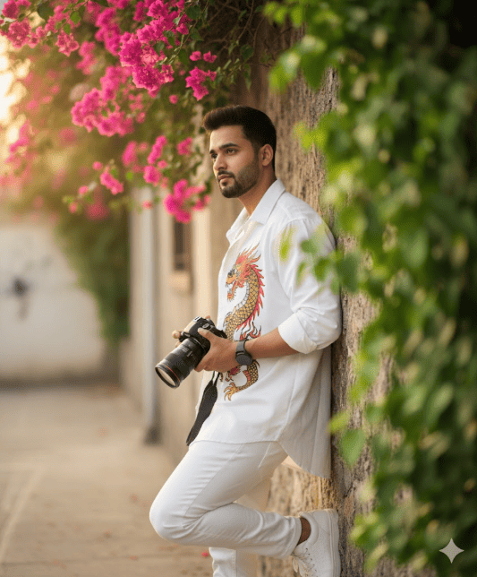 A stylish young man (refrence image given) with a dark messy hairstyle , wearing a white oversized stylish front name: dragon printed shirt. White pant and white sneakers. He is looking thoughtfully off-camera, captured in a candid, high-key cinematic outdoor portrait. Holding lenses camera and push wall. The composition is framed by a branch of vivid magenta/pink bougainvillea flowers in the upper left corner and heavily blurred green leaves in the extreme,side shot with contrast.