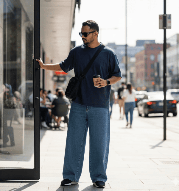 The image of a man who looks like the original picture, the hairstyle is the same as the original, wearing sunglasses. He wears a dark blue T-shirt, loose fit, jeans, long legs, large cylinders, wide legs. Black shoulder bag The gesture of opening the door and walking outside. One hand is holding a coffee cup naturally. Outdoor pose in front of the cafe, street fashion style. Bright and modern atmosphere, clear natural light, 8K sharpness.