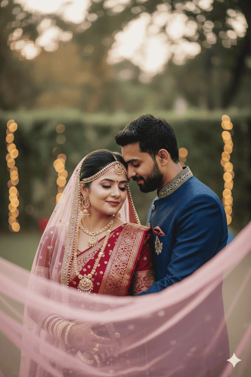 100% (reference face),, create Close-up, romantic wedding portrait. South Asian couple. Bride in deep red/maroon traditional bridal wear, heavy gold jewelry, henna on hands, eyes closed with serene expression. Groom in dark suit/sherwani, head leaning towards bride's, arm around her. Pink sheer dupatta/veil softly draped over their heads/foreground. Soft, diffused outdoor lighting, blurred natural background. Intimate, emotional, cultural wedding photography.