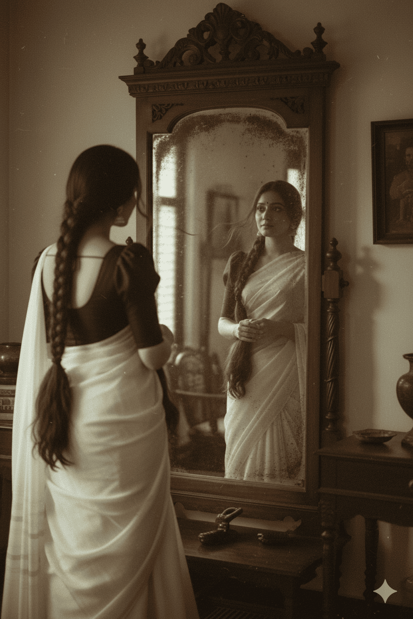 Create a retro vintage inspired image-grainy yet bright- based on the reference picture. The girl should be draped in a perfect dark whitecotton saree with a puffed same colour blouse. Pinterest style aesthetic saree. The vibe must capture the essence of a 90s movie dark brown hair upto waist level with jimiki extension to hair enhanced by windy, romantic atmosphere and She looks to an old traditional mirror inside a old kerala tharavadu, 8k hd quality without changing her face