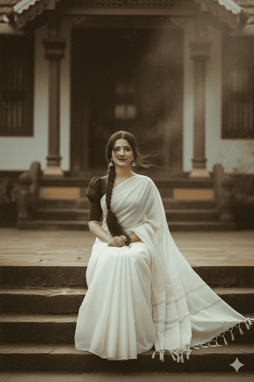 Create a retro vintage inspired image-grainy yet bright- based on the reference picture. The girl should be draped in a perfect dark coffe white cotton saree with a puffed same colour blouse. Pinterest style aesthetic saree. The vibe must capture the essence of a 90s movie dark brown hair upto waist level with jimiki extension to hair enhanced by windy, romantic atmosphere, 8k hd quality without changing her face exactly same 100% identical .She is sitting Infront of Kerala traditional tharavaadu home with light sm