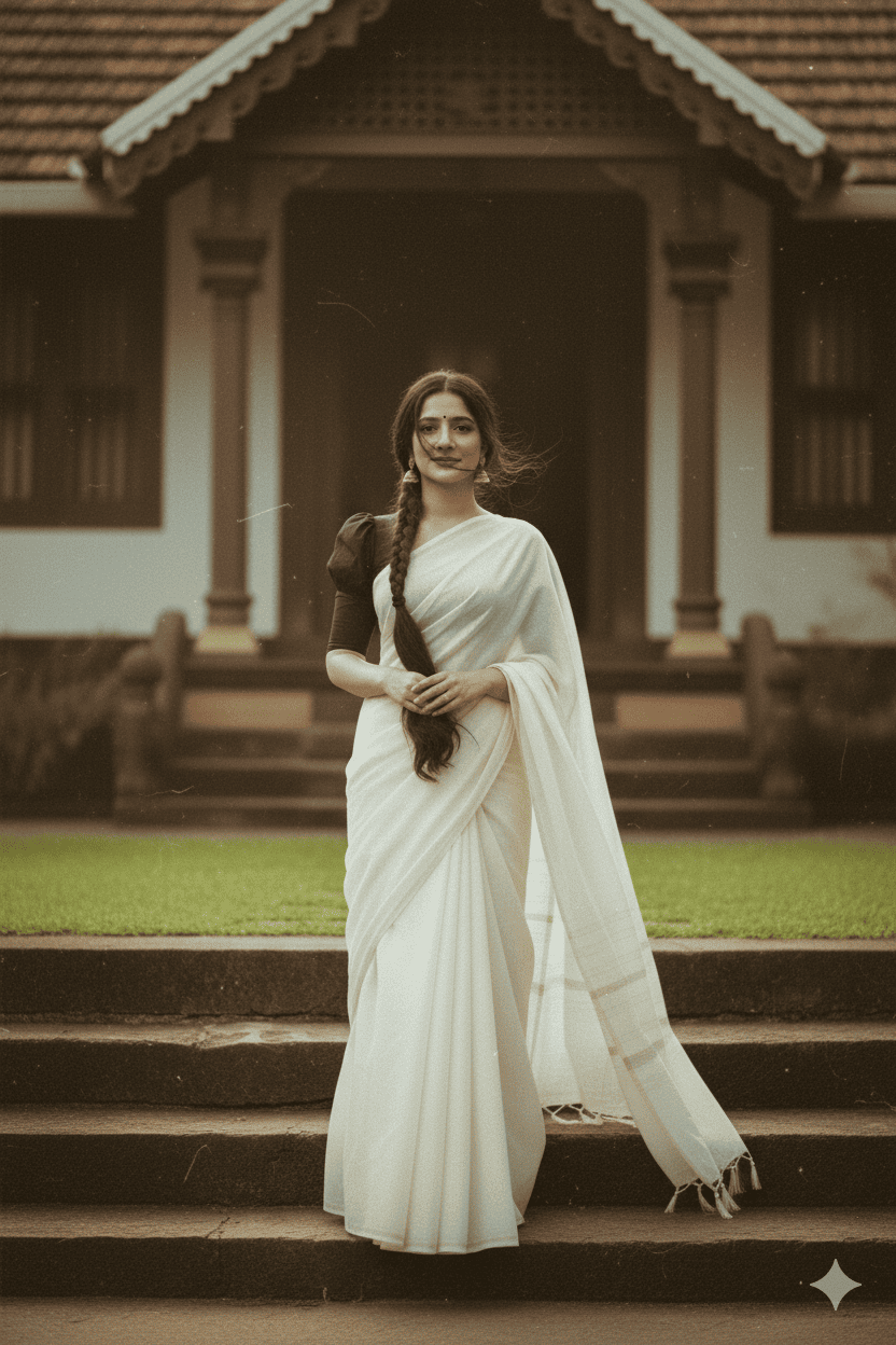 Create a retro vintage inspired image-grainy yet bright- based on the reference picture. This photo is full body create. The girl should be draped in a perfect dark coffe white cotton saree with a puffed same colour blouse. Pinterest style aesthetic saree. The vibe must capture the essence of a 90s movie dark brown hair upto waist level with jimiki extension to hair enhanced by windy, romantic atmosphere, 8k hd quality without changing her face exactly same 100% identical .She is standing Infront of Kerala traditional tharavaadu home with light sm